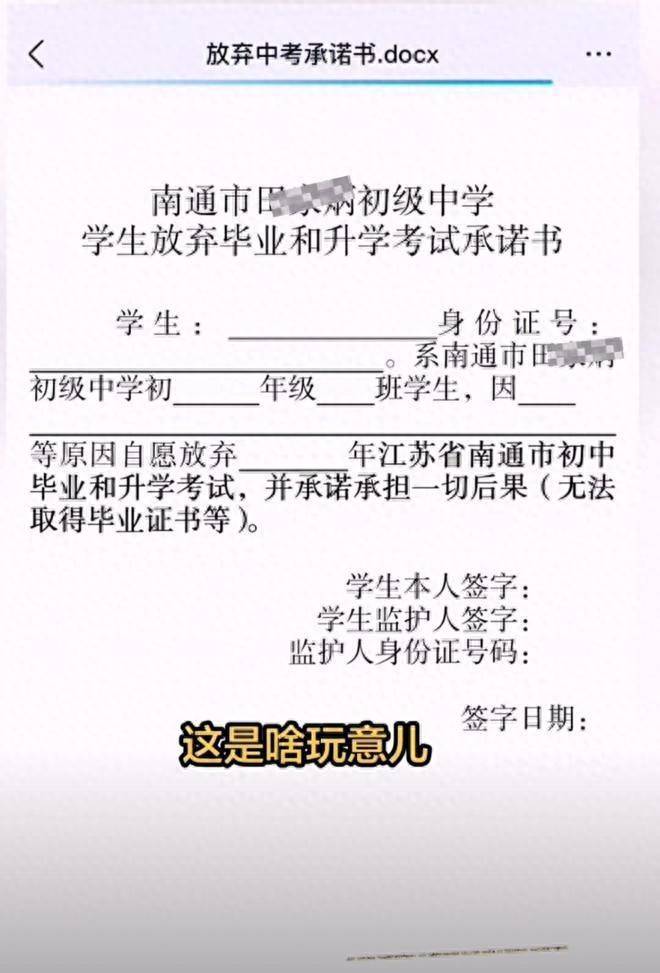 该工作人员介绍,但实际中会存在极个别学生主动放弃参加中考,如选择去国外读书的、高水平运动员等。对此情况,根据上级要求,需要签该承诺书,“不参加中考就没有毕业证书,但有的人不参加又想要毕业证。签承诺书就是事先告知后果,防止以后纠纷。”