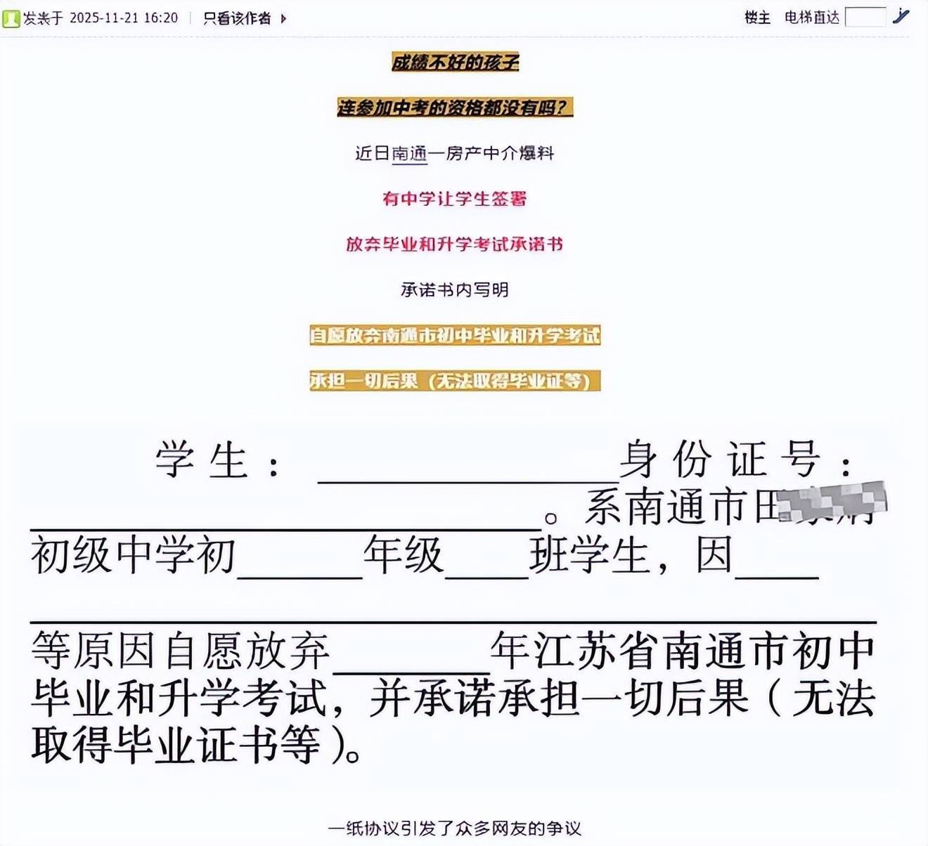 近日,网友反映,江苏南通一初中存在《放弃中考承诺书》,上面写道:因某原因自愿放弃初中毕业和升学考试,并承诺承担一切后果(无法取得毕业证书等)股票配资助手网,质疑学校会让成绩不好的孩子签该承诺书。
