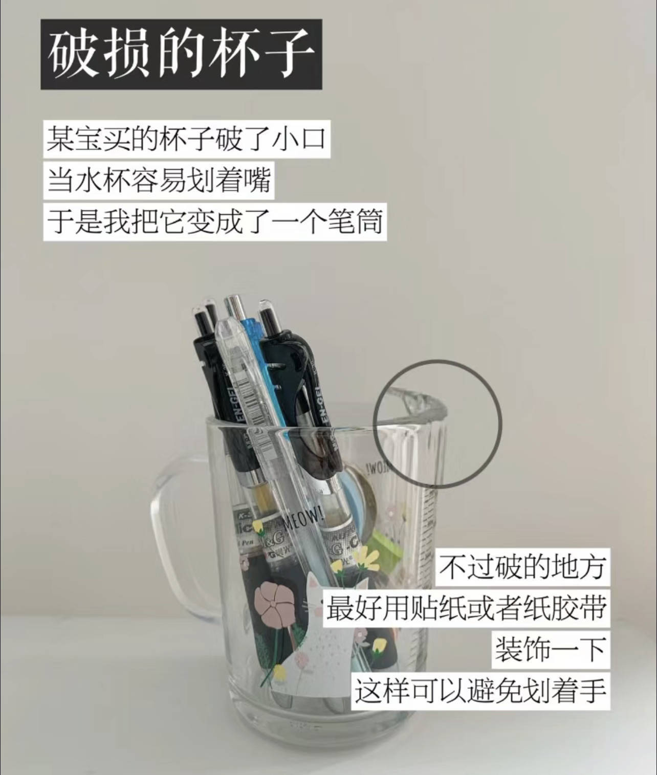 2、破损杯子利用当初买来喝水的杯子,磕破了一点边,继续用的话容易划着嘴,扔了怪可惜的。