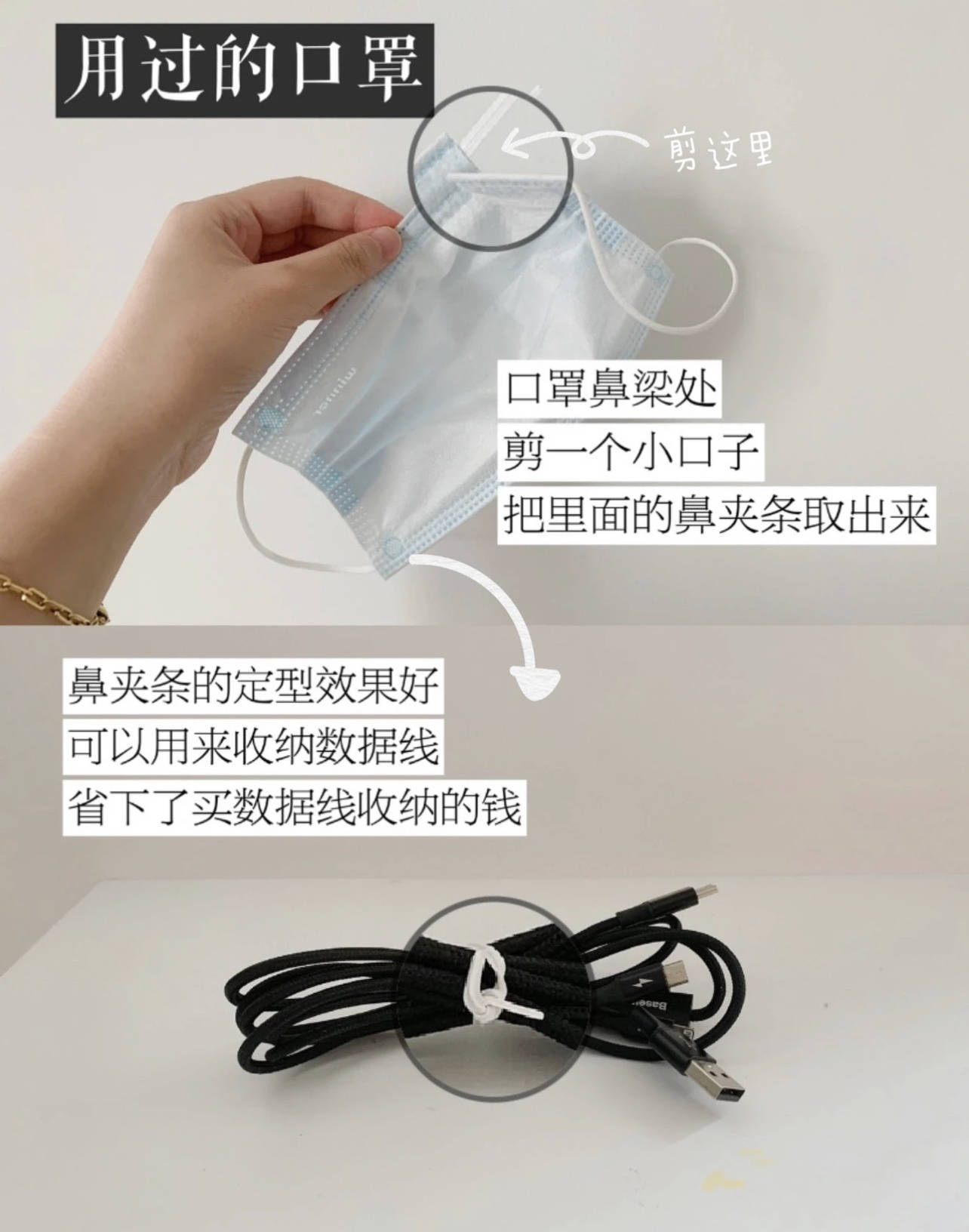 将用过的口罩,剪一个小口,藏在里面的鼻夹条拿出来,因为可塑性好,用来捆绑收纳数据线很不错,这不就废物利用的同时,省下了买数据线收纳的钱么?
