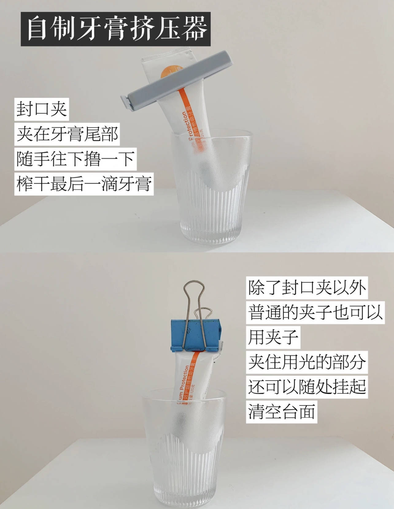 或者是,普通的燕尾夹,辅助挤牙膏的同时,还能将牙膏挂起来,解放台面控价;