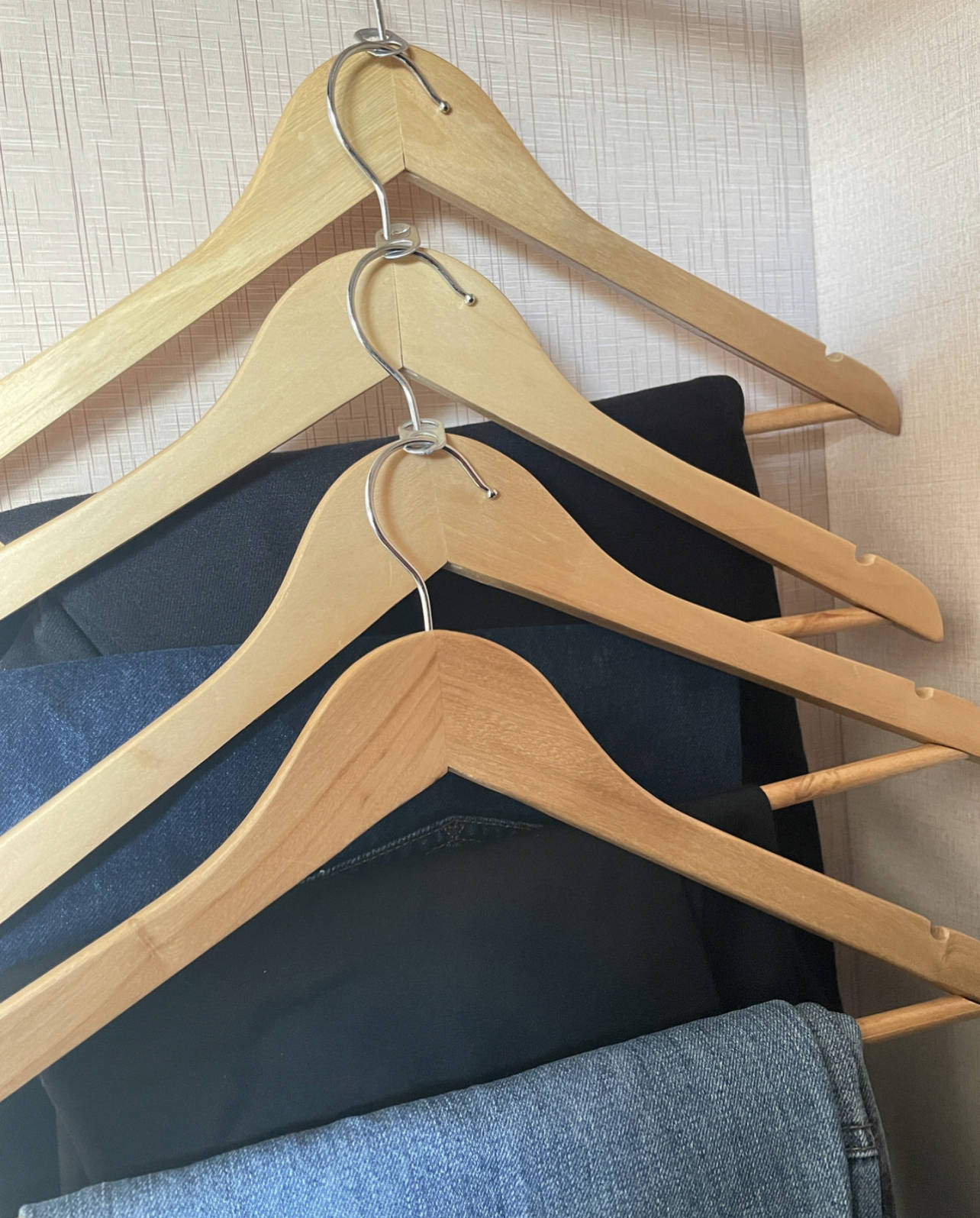尤其是男士裤子和小朋友的衣服,正常挂起来,底下会空出很多空间,用它三两个衣架串在一起,同样的空间也能多挂几件衣物。