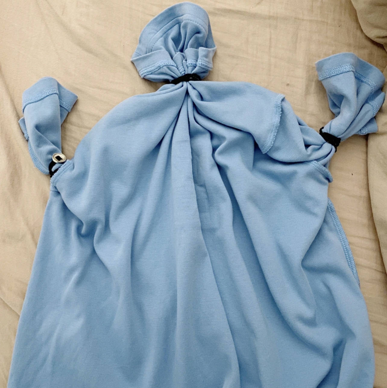 将领口和袖口用皮筋扎起来,然后衣服就能变成一个收纳包袱,如果对颜值要求不太高的话,用来塞过季床品、被子,干净又防尘。