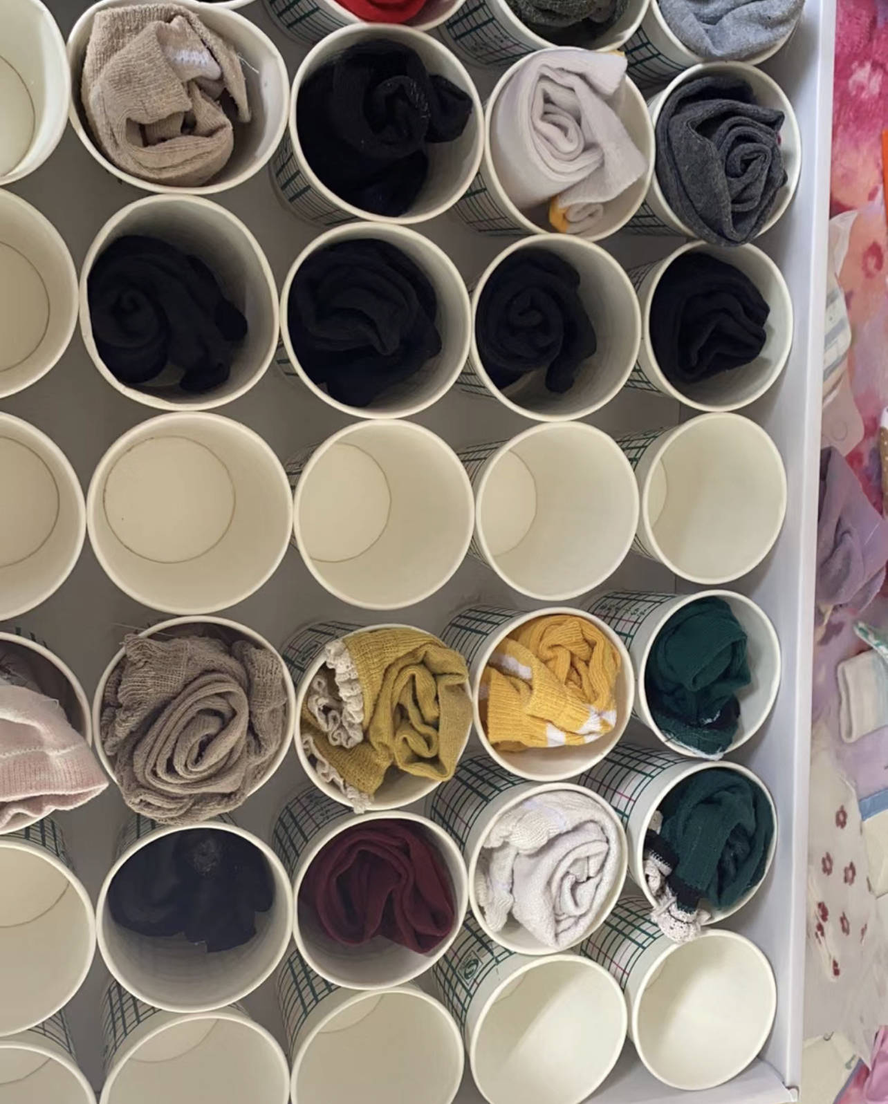 8、一次性纸杯装袜子也不知道这是哪个鬼才发明的袜子收纳法,但敢肯定的是,那些卖袜子收纳盒的资本家看了肯定会抓马,而且严重批判这是凑合的方法。